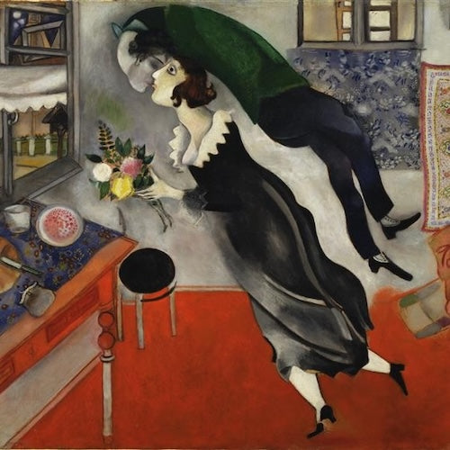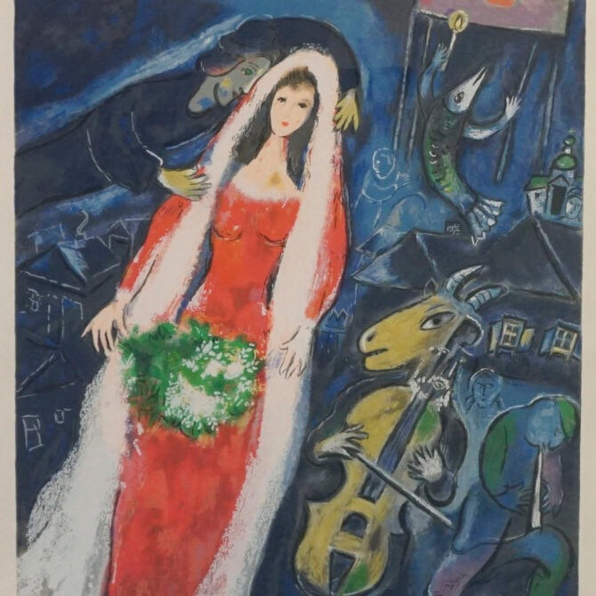 Marc Chagall was a Russian-born French artist celebrated for his dreamlike imagery and poetic use of color. Born in Vitebsk, in present-day Belarus, Chagall blended elements of Surrealism, Cubism, and Fauvism into a deeply personal visual language rooted in memory, folklore, and spirituality. His floating figures, vibrant villages, and symbolic animals appear in iconic works such as I and the Village (1911). Working across painting, stained glass, ceramics, and stage design, Chagall created a body of work that bridges fantasy and emotion, making him one of the most lyrical voices of modern art.